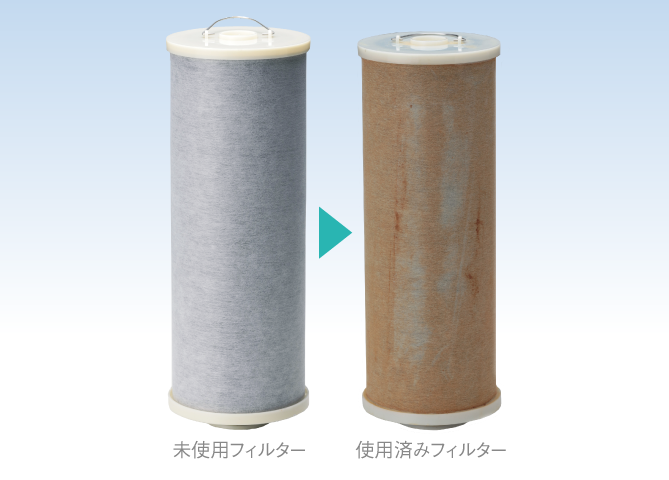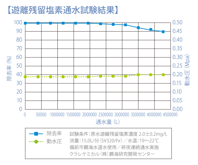 高性能活性炭で塩素などを強力に除去!遊離残留塩素ろ過性能としては500トンの処理が可能です(90%破過値)。