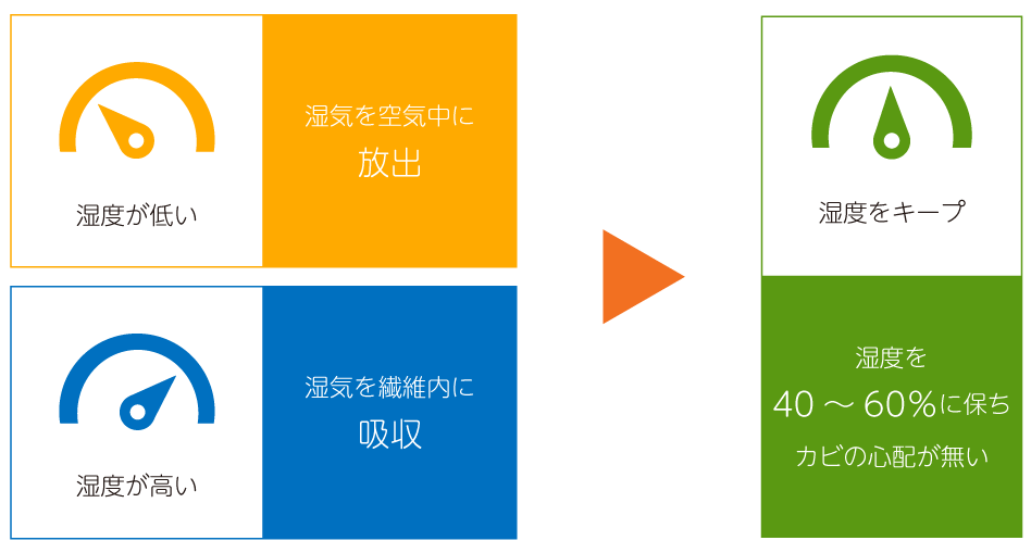 これにより表面はさらっとしていながらも、内側は湿気を吸放湿する事で優れた調湿機能を発揮します。