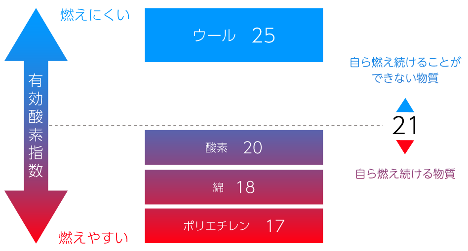 ウールは着火しても火源を取り除けば燃焼し続けることなく、短時間くすぶるだけで消える特性をもつ。