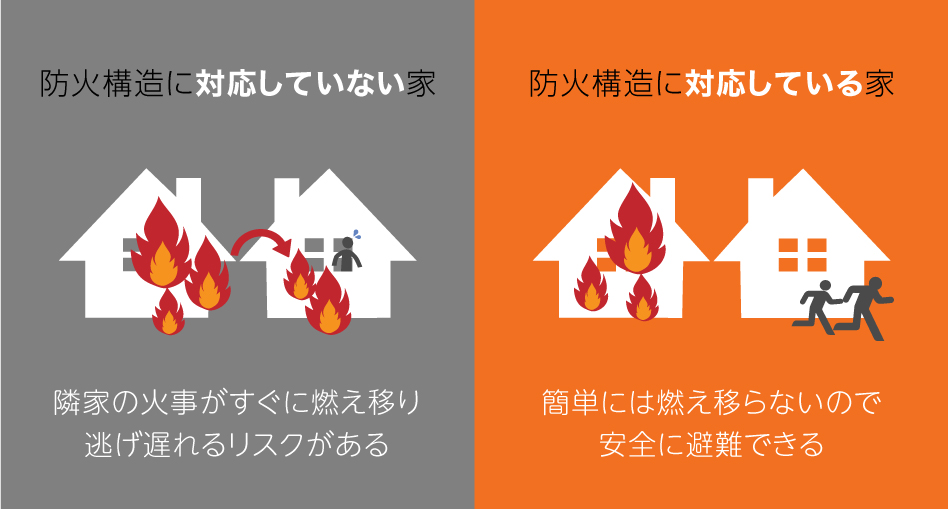 防火構造とは、近隣で起きた通常の火災が燃え移ってくるのを一定時間(30分間)防ぐことができる構造のこと。